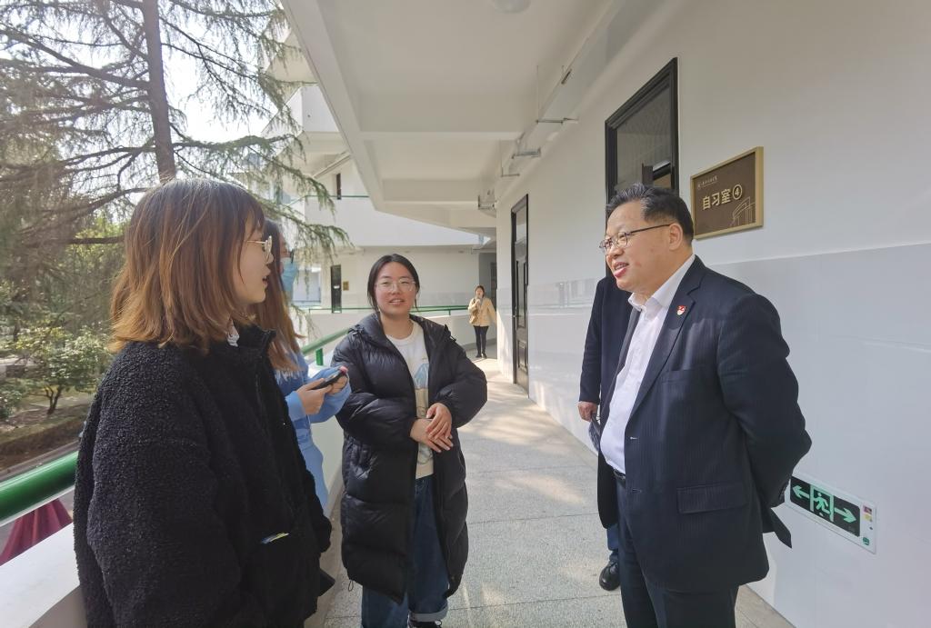 盛付祥实地查看了学校考研教室、启航楼、校医院、西办公楼、学生公寓、体育馆、图书馆、电教楼等建筑场所,详细了解了建筑楼宇的面积、楼层布局、原有用途等情况。在走访过程中,盛付祥仔细查看了教职员工及学生的工作学习环境,并与师生们亲切交谈,询问工作学习状况,倾听师生们对学校发展的期盼和建议。