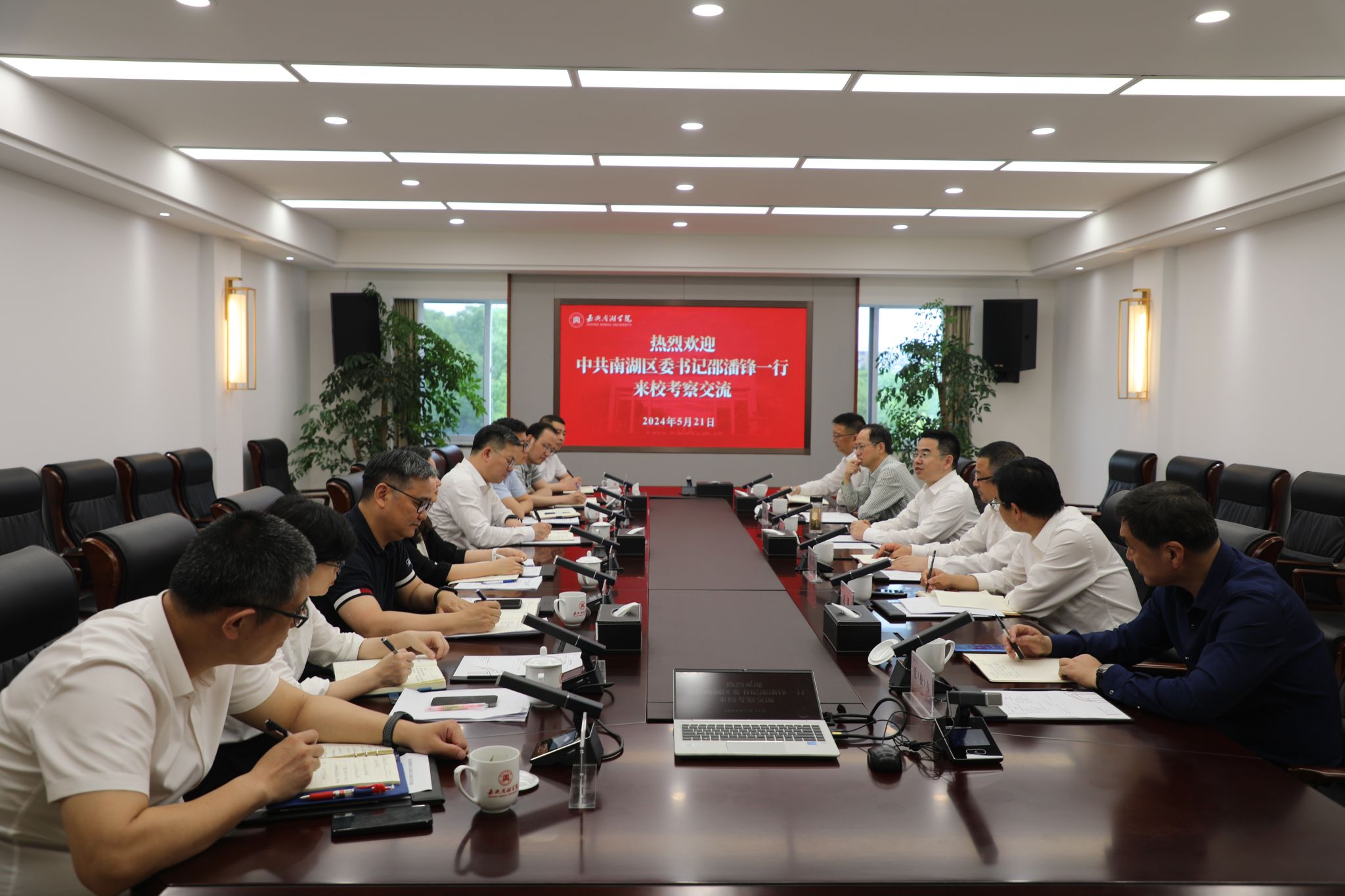 5月21日下午,南湖区委书记邵潘锋一行来访,校党委书记倪沪平接待邵潘锋一行,双方就平台共建、校园周边安全保障、人才培养等方面进行了深入交流。我校领导胡文蔚、李泉明、赵渊、沈岱峰,南湖区领导虞武君、王存乡、傅政霖参加洽谈。