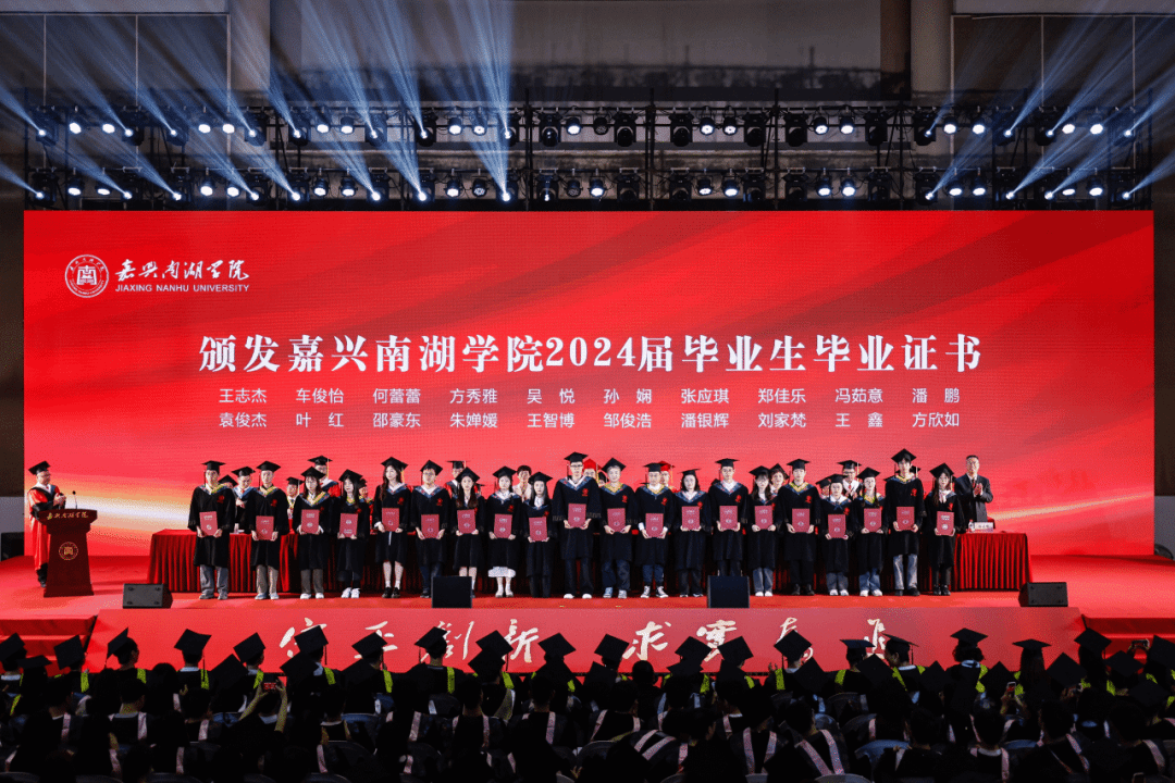 全体出席校领导为获得表彰的学生代表颁发荣誉证书,为2024届毕业生代表颁发毕业证书,为校友联络员颁发聘书。倪沪平为“南湖证书”获得者颁发证书。